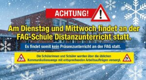 aufgrund der aktuellen Wetterlage mit anhaltenden Schneefällen, sehr niedrigen Temperaturen sowie ausgeprägter Rutsch- und Glatteisgefahr hat die Schulleitung der Friedrich-August-Genth-Schule entschieden, den Unterricht am Dienstag, den 27.01.2026, und Mittwoch, den 28.01.2026, vollständig auf Distanzunterricht umzustellen. Es findet somit kein Präsenzunterricht an der FAG statt. Wir folgen damit der Empfehlung des Staatlichen Schulamts und des Main-Kinzig-Kreises.